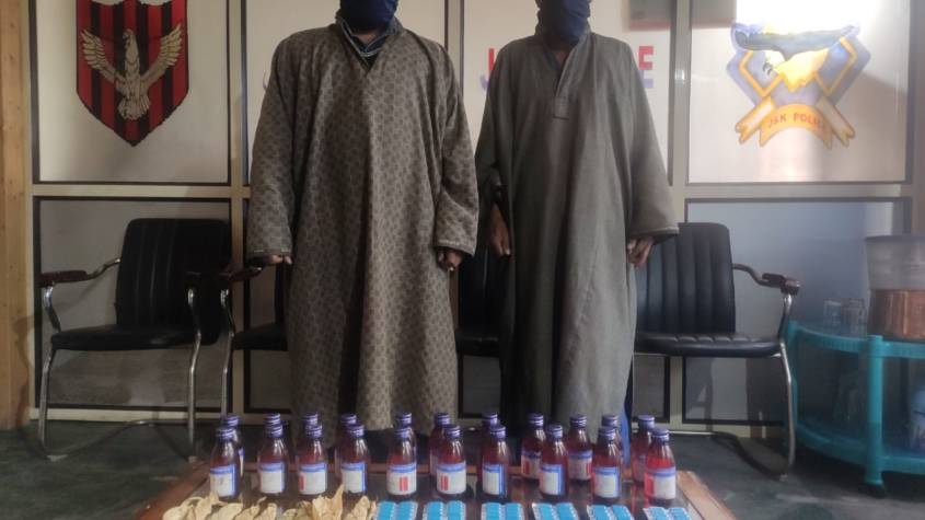 Today Police party from Police Station Bijbehara laid a Naka at the Arwani railway crossing and apprehended two persons along with 21 bottles of Codeine, 144 Sspasi-plus capsules, and 9 Charas lathies. The two accused persons namely Mohd Ashraf Ganie S/O Mohd Akbar Ganie resident of Khrewan Chader Qaimoh and Mohd Yousuf Dar S/O Ab Khaliq Dar resident of Rakh Momin were arrested and contraband was seized.