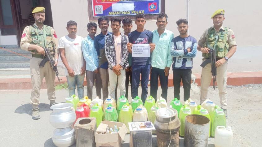 Anantnag, 10 August : In a major crackdown, Anantnag Police seized a substantial quantity of country-made liquor, along with the equipment used for its production, during a routine inspection at Brick Kiln Jan Thajiwara, owned by Tanveer Ahmad. Eight individuals were arrested at the scene, and ₹13,600 in cash, believed to be the proceeds from liquor sales, was also confiscated.
