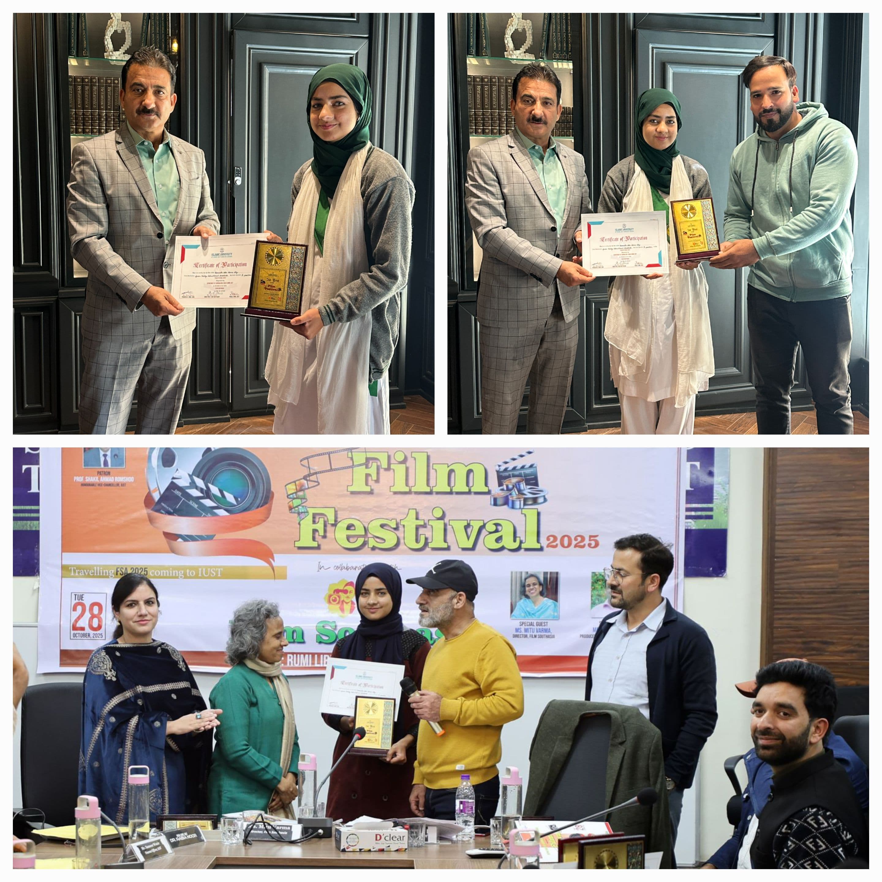 Srinagar, Oct 29: Green Valley Educational Institute (GVEI) has created a new milestone as its Class 11 Media Studies student, Muntaha Masoodi, clinched the Second Position in the student film category at the Travelling Film Southasia (FSA) Film Festival 2025. The prestigious event was hosted by the Department of Journalism and Mass Communication (DJMC), Islamic University of Science and Technology (IUST), Awantipora, in collaboration with Film Southasia (FSA), Nepal.