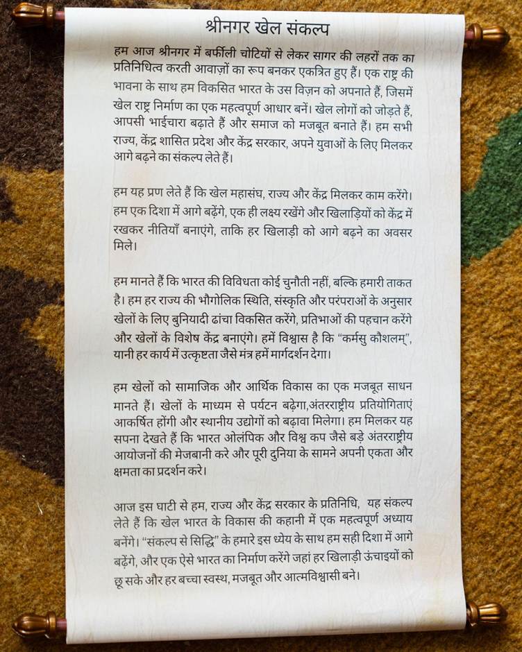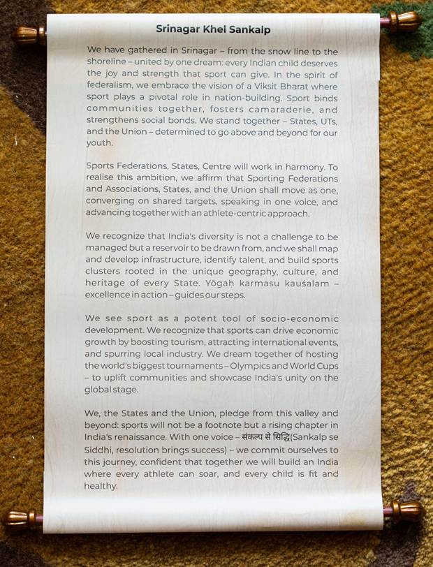 The Srinagar Khel Sankalp reflects a unified resolve of the Centre, States, and Union Territories to place sports at the heart of nation-building, recognising its role in fostering social cohesion, strengthening communities, and shaping a healthier, more empowered generation. It emphasises a collaborative and athlete-centric approach, where governments and sporting bodies work in harmony, aligning efforts and resources to create a seamless and supportive ecosystem for athletes across the country.