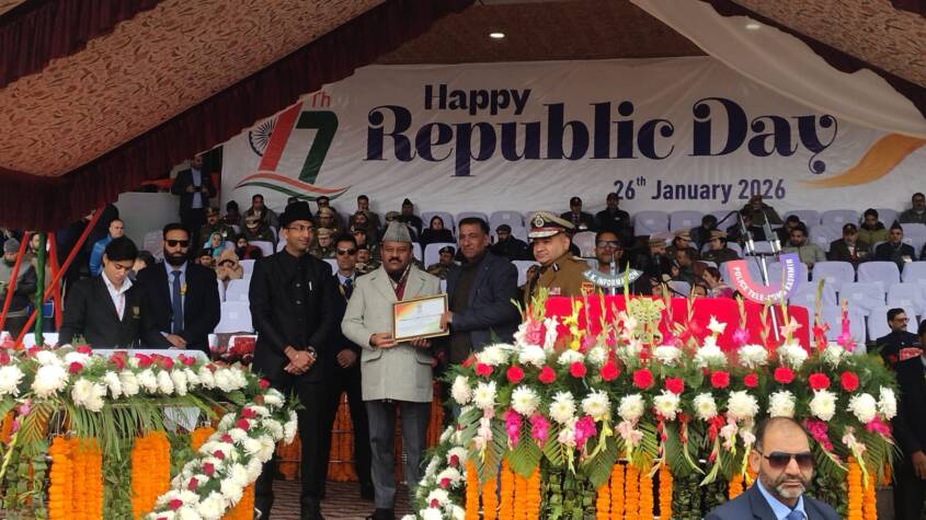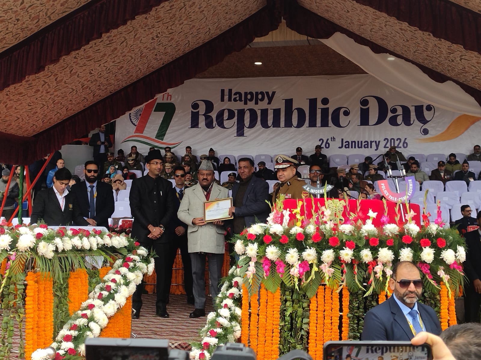 Srinagar, January 26: Assistant Information Officer Shabir Ahmad was felicitated by Deputy Chief Minister Surinder Choudhary at the 77th Republic Day celebrations held at Bakshi Stadium here on Monday, in recognition of his dedicated public service.