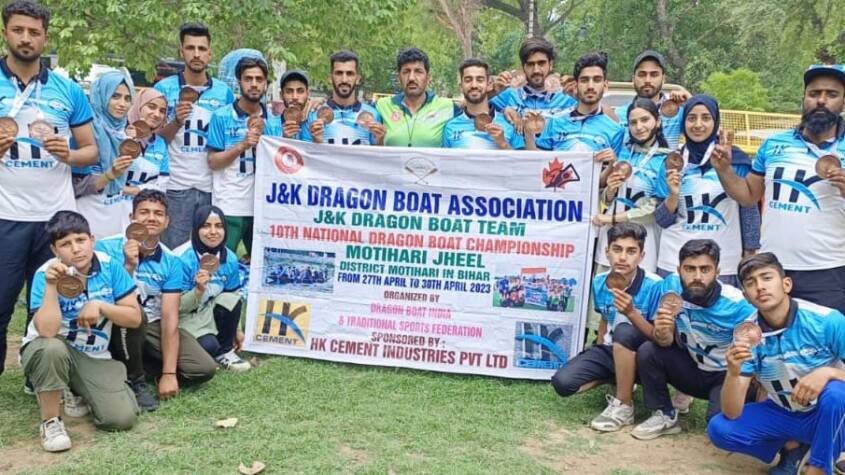 Srinagar 5.5.2023: At the 10th National Dragon Boat Championship, which was held at Motihari Jheel in Bihar, recently, the J&K Dragon Boat Team comprising 26 members and sponsored by HK Cements Pvt Ltd won two bronze medals in the 1000 meters and 500 meters events.