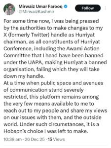 In a post on X, Mirwaiz said that authorities had warned him that his account would be taken down if he failed to remove the reference to Hurriyat Conference, as all its constituents, including the AAC which he heads, stand banned under UAPA.