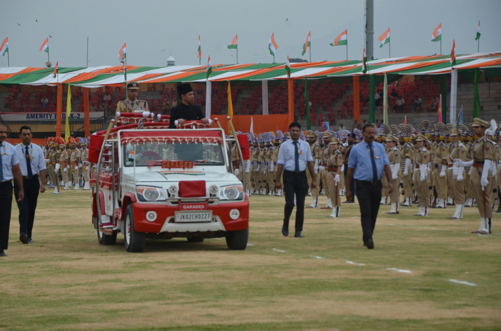 Srinagar: A tight security blanket has been thrown around Bakshi Stadium, the main venue of Independence Day function in Jammu and Kashmir, to ensure incident-free celebrations in the valley.A full dress rehearsal of the parade was held here on Wednesday at the Bakshi Stadium where Divisional Commissioner V K Bhiduri took the salute at the march past.”We have made multi-tier security arrangements for the Independence Day celebrations. High rise spotters have been deployed to maintain vigil,” Inspector General of Police Kashmir Zone V K Birdi told reporters here after the full dress rehearsal.