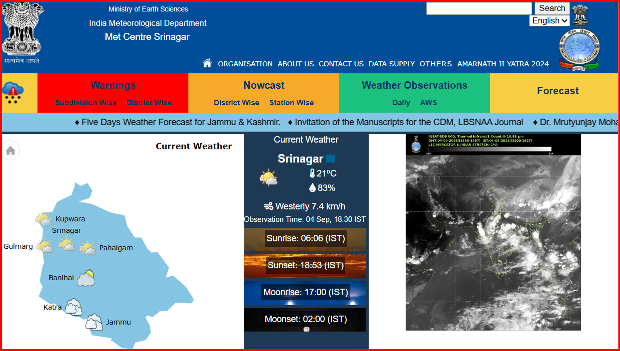 Srinagar, Sept 4: The India Meteorological Department (IMD) has issued a day-wise weather forecast for Jammu & Kashmir for the period 4–10 September 2025. As per the bulletin, the region will witness scattered to isolated light rain and thundershowers over the next few days, with no warning for heavy rainfall issued.