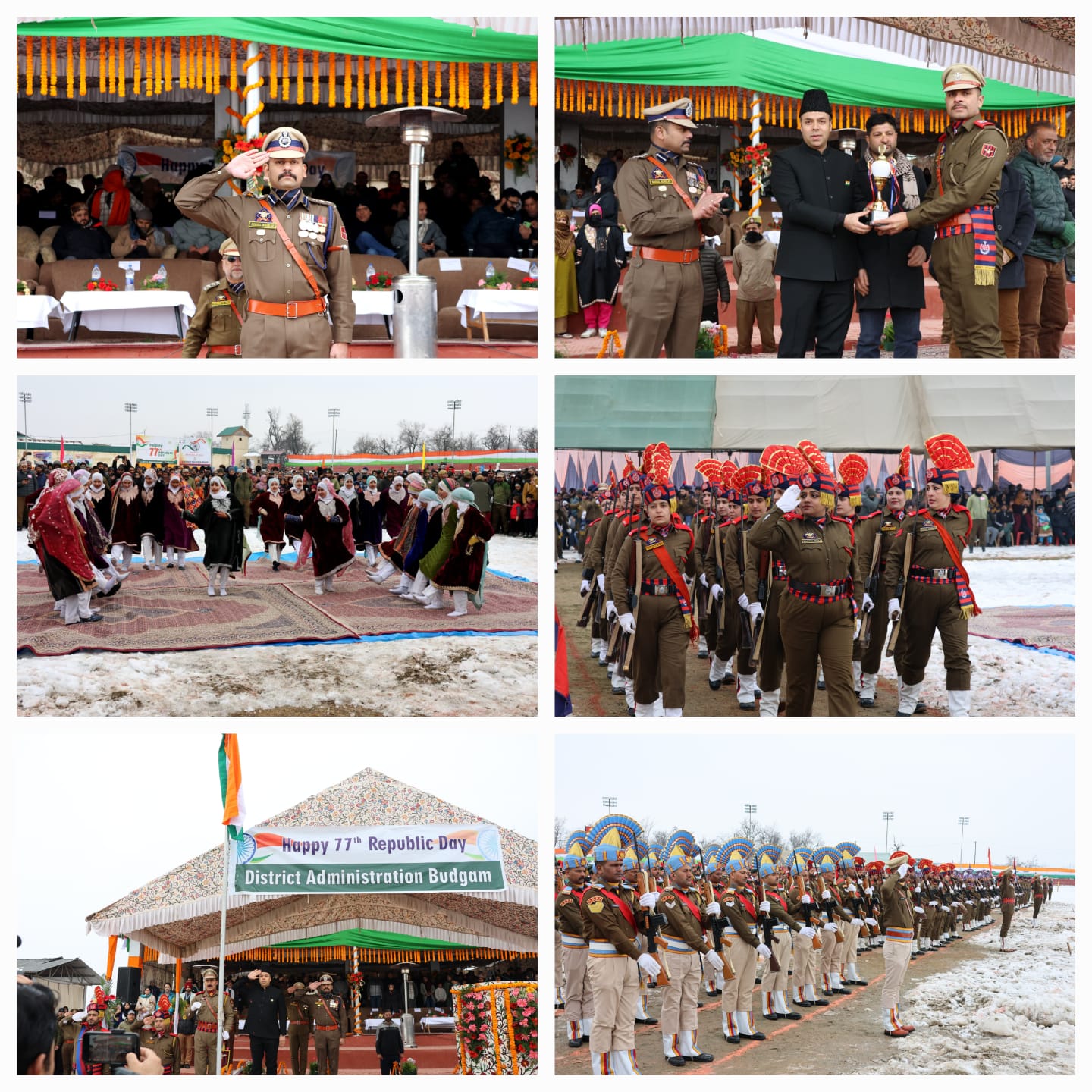 Budgam, January 26: The 77th Republic Day was celebrated with great enthusiasm, national pride, and patriotic fervour across district Budgam. The main function was held at the Sports Stadium Budgam, where Dr. Bilal Mohiuddin Bhat (IAS), Deputy Commissioner Budgam, unfurled the National Flag and took the salute, accompanied by Shri Nikhil Borkar (IPS), SSP Budgam.