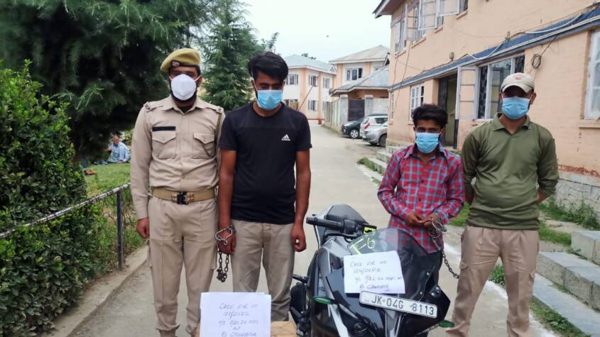 During naka checking at Hussipora crossing, police party from Police Station Chadoora intercepted one motorcycle bearing registration number JK04G-8113 coming towards chadoora. When police party signalled the biker to stop, he and the pillion rider tried to flee from the spot but were tactfully stopped. During search of rider & pillion rider, police party recovered 22 polythene packets of Heroin like substance weighing about 04 grams & controlled drug Alprazolam 298 tablets from their possession.