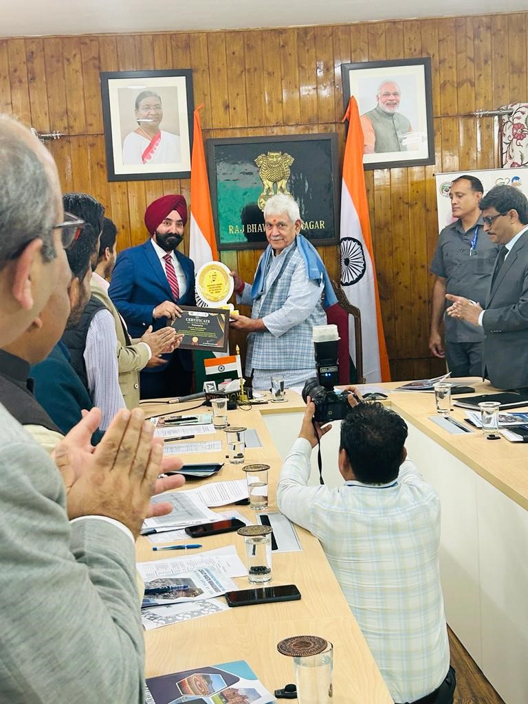 Jammu and Kashmir Lieutenant Governor Shri Manoj Sinha handed over the certificate of achievement to Mr. Charandeep Singh in presence of Chief Secretary, J&K Dr. Arun Kumar Mehta, and Commissioner/ Secretary to Government Department of Rural Development and Panchayati Raj, J&K during the ‘Swachh Bharat Diwas’ celebration event organized by the Department of Rural Development and Panchayati Raj at Raj Bhawan, Srinagar.