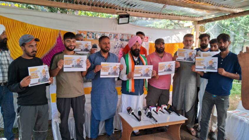 Tral, September 14: Surinder Singh Channi, the NC-Congress candidate for the Tral constituency, held a press conference on Thursday and released his manifesto for the upcoming elections. Channi outlined his vision for the development of Tral, focusing on key areas such as employment, infrastructure, tourism, and public services.