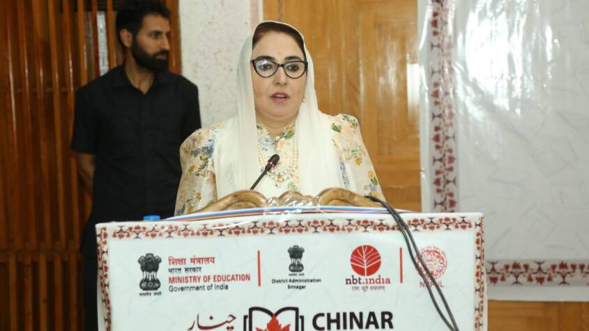 Srinagar, 7 August: Chairperson of Jammu & Kashmir Waqf Board & Minister of State Dr Syed Darakhshan Andrabi today participated in the Inauguration Event of a three-day training workshop titled “Development of Literary & Creative Skills in New Generation” organized by the National Council for Promotion of Urdu Language at the Chinar Book Festival 2025 as Chief Guest today. Dr Darakhshan Andrabi said that our new generation has greater potential and she was convinced about their creative potentialities. “We only need to chisle the talent of our youth and provide them suitable platforms to express themselves. Encouragement and poshing the capabilites of our young generation can give us surprising results”, said Waqf Board Chairperson. She congratulated the Director of National Council for Promotion of Urdu Language (NCPUL) and the Dean Arts of Kashmir University Prof Ainaz Mohammed Sheikh for organising this much needed workshop for young writers on the sidelines of the Chinar Book Festival. “We have come out of a long speel of suppression and violence which has crushed the potentialities of our youth. Such fairs, festivals and workshops are a necessity to let our youth come out of the darkness of suppression and express themselves with positivity and confidence “, said the writer politician Andrabi.